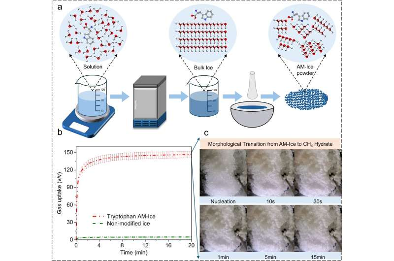 In a new study, “Rapid conversion of amino acid modified-ice to methane hydrate for sustainable energy storage,” published in Nature Communications, the researchers showed that freezing water with a small amount of these naturally occurring compounds produces an “amino-acid-modified ice” that locks in methane gas in minutes. In tests, the material reached 90% of its storage capacity in just over two minutes, compared with hours for conventional systems.
